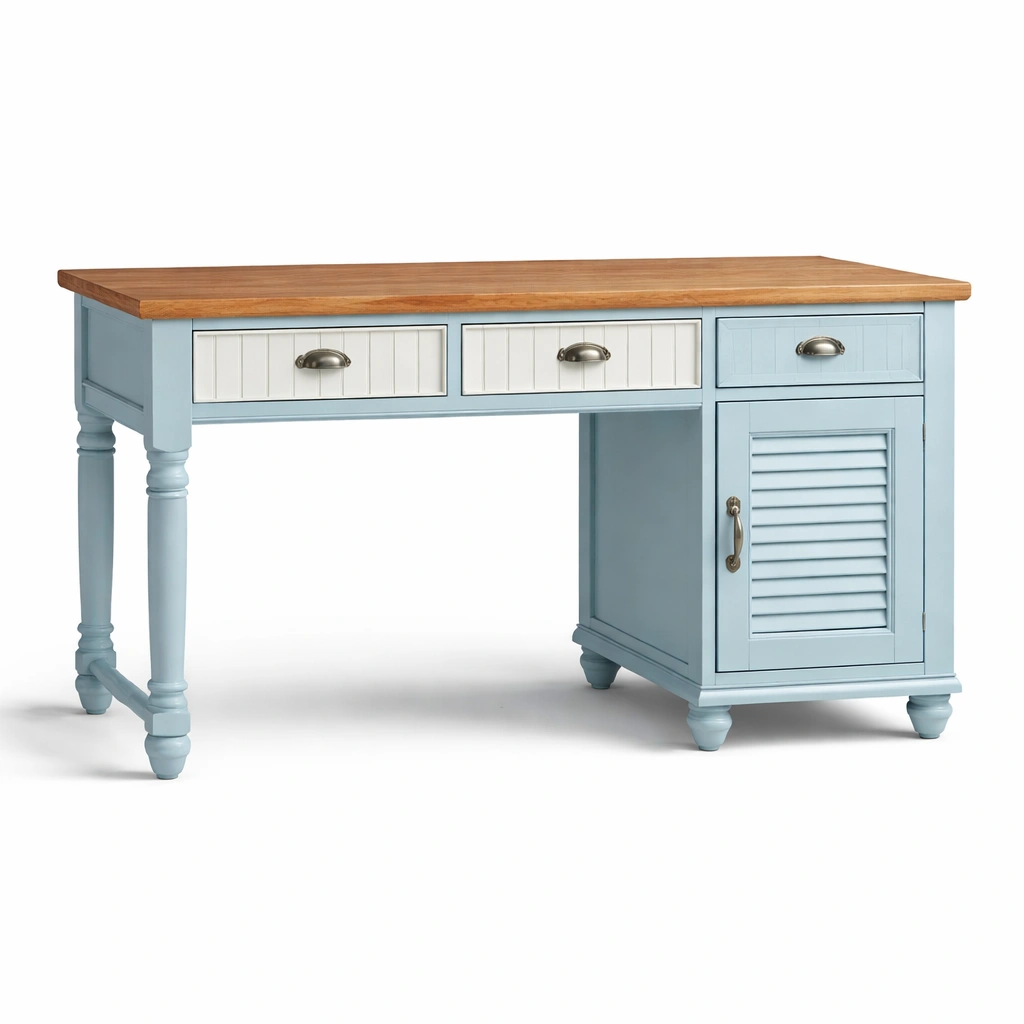 Escritorio de madera con cajones y puerta azul claro y blanco