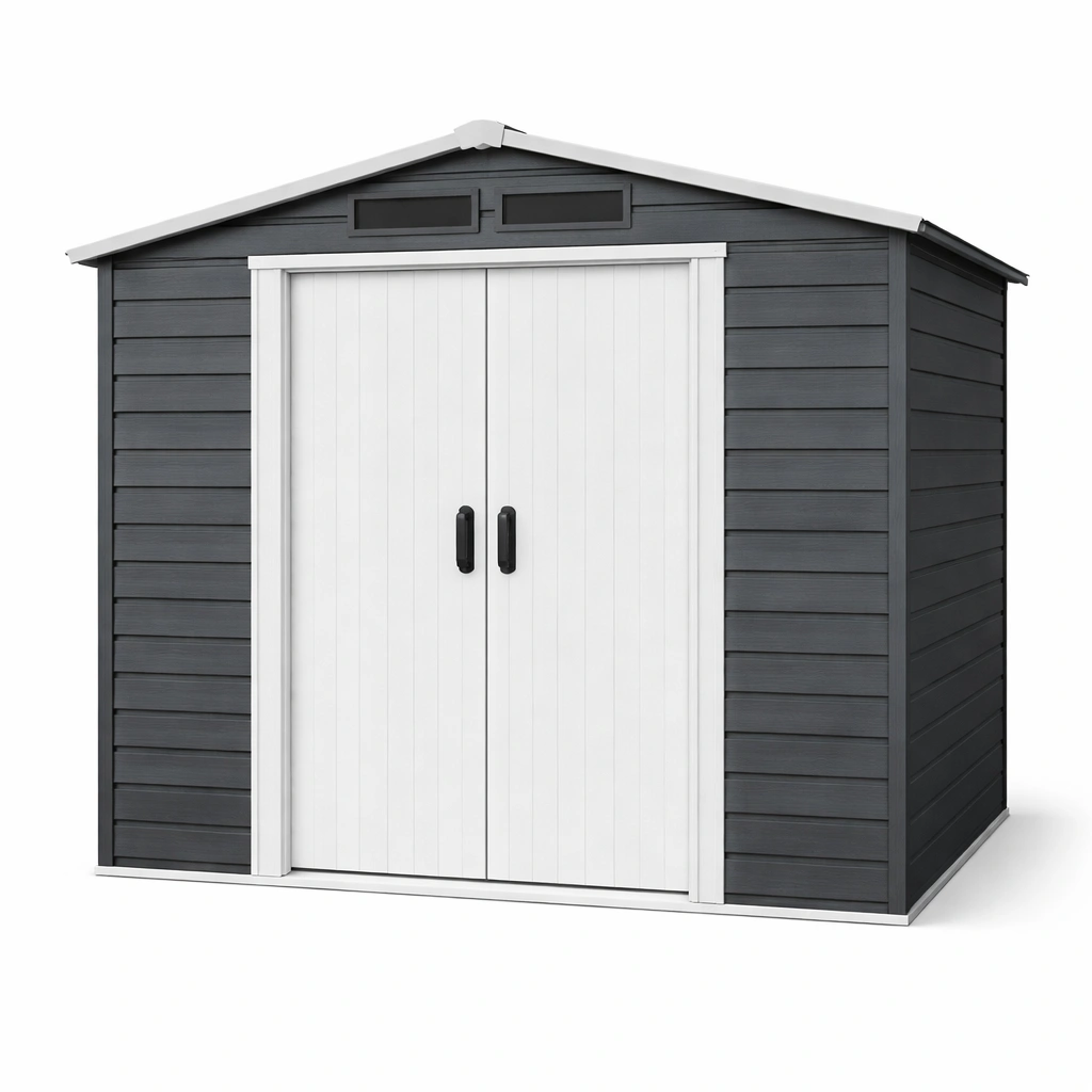 Este cobertizo está fabricado con paneles de polipropileno resistentes al agua, proporcionando durabilidad y protección en exteriores.