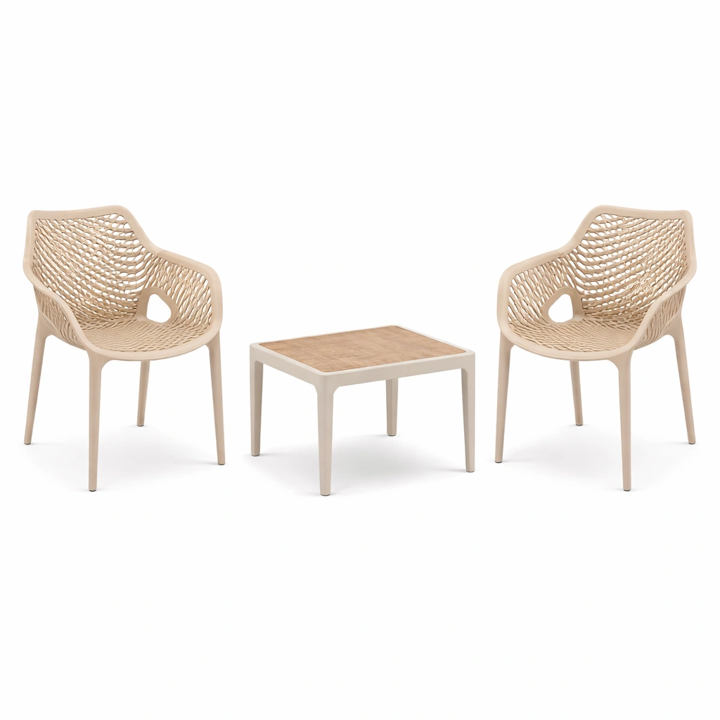 - 2 sillas de polipropileno con diseño tejido: Ancho 60 cm x Alto 85 cm x Profundidad 60 cm
