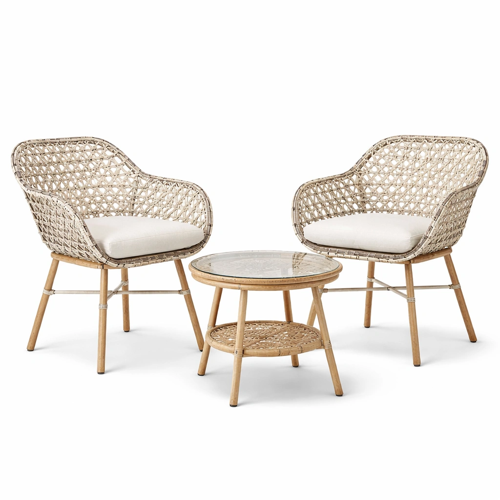 Este conjunto incluye dos sillas y una mesa. Las sillas tienen una estructura de acero recubierta de ratán sintético. Los cojines están fabricados en poliéster. La mesa cuenta con una superficie de vidrio templado de 5 mm de grosor. Dimensiones: silla 60 cm de ancho x 60 cm de fondo x 80 cm de alto, altura del asiento 45 cm; mesa 50 cm de diámetro x 45 cm de alto. Peso máximo soportado por silla: 120 kg.